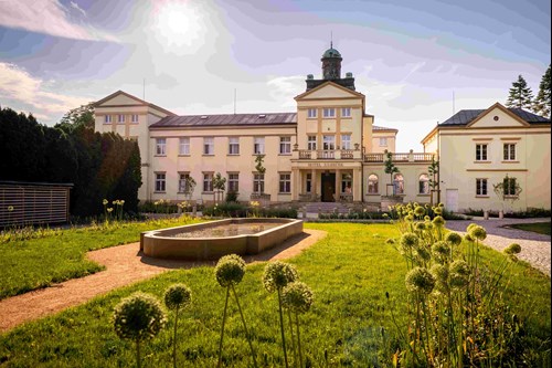 Unikátní architektonický skvost z 20. let minulého století je umístěn v upravené zámecké zahradě v těsné blízkosti řeky Labe i centra Poděbrad. Součástí hotelu je balneoprovoz, restaurace, stylová zámecká kavárna Modrý salonek a také služby kadeřnictví, kosmetiky a pedikúry. Hotel je tvořen hlavní budovou a depandancí (vedlejší budova). Klienti jsou primárně ubytováni na hlavní budově v komfortních a prostorných pokojích a apartmánech. (v případě vyšší obsazenosti je využívána depandance, která nabízí shodné vybavení). Hotel nabízí částečně bezbariérový přístup a děti jsou vítány.