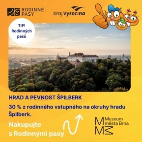Další App Kupón můžete použít při prohlídce hradu a pevnosti Špilberk, o kterém první písemná zmínka pochází z roku 1277. Využijte App Kupón z Aplikace Rodinných pasů na 30 % slevu z rodinného vstupného na okruhy hradu Špilberk. Nabídka trvá od 1. do 31. října 2025. Slevu lze uplatnit pouze při nákupu na pokladně, uplatněním App Kupónu (nevztahuje se na nákup vstupenek online). Více informací o hradu Špilberk naleznete na https://www.spilberk.cz/