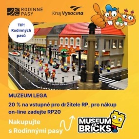 Rodinné pasy vám nabízí mimořádnou 20 % slevu na vstupné do Muzea Lega v Praze, domově největší soukromé sbírky LEGO® stavebnic na světě, která je zapsaná v Guinnessově knize rekordů. Svět, kde se z obyčejných kostiček LEGO® rodí fantastické stavby, od majestátních hradů až po futuristická vesmírná plavidla. Muzea plná nostalgických setů, která Vás vrátí do dětství. Nabídka trvá od 1. do 31. října 2025. Při objednávce vstupenek online na https://museumofbricks.cz/ použijte do slevového kupónu kód RP20. Při nákupu vstupenek přímo na pokladně uplatněte APP Kupón z aplikace.